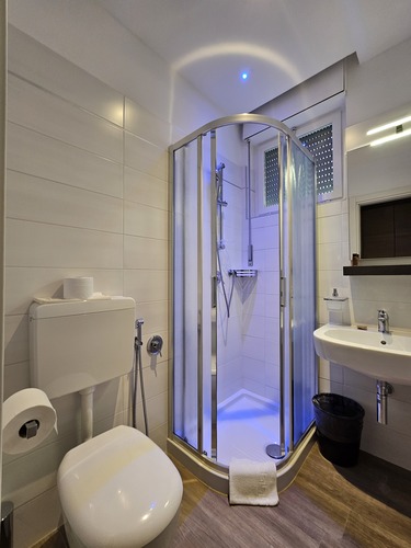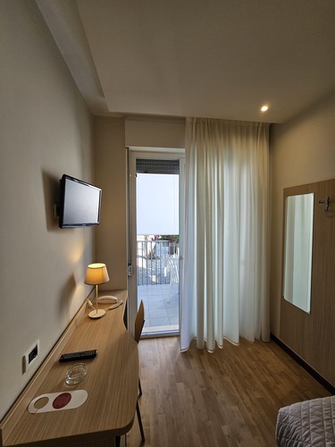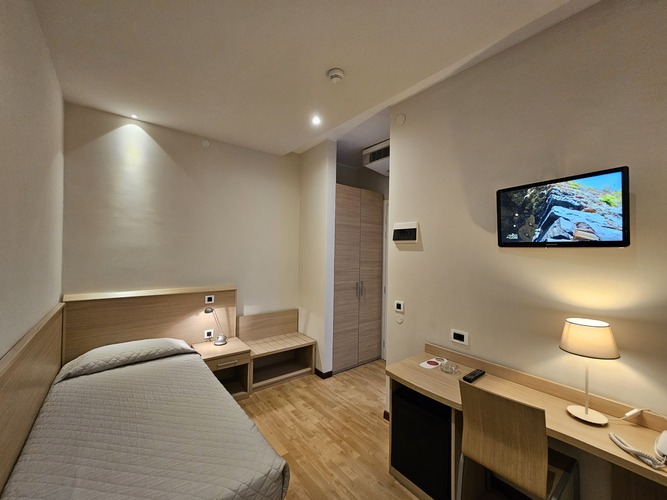 Comfortable room with a warm and welcoming style. The room features a balcony with chairs, table and privacy curtain, a 90x200 single bed, minibar, safe, new bathroom with shower enclosure and WC, 28" flat-screen TV, Wi-Fi and air conditioning.