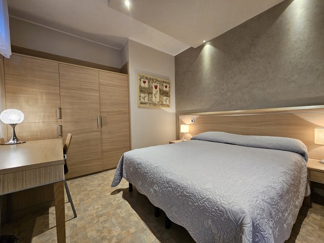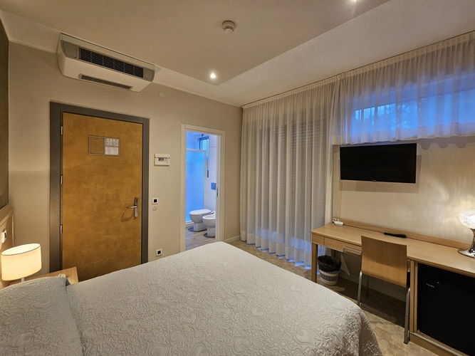 Confortevole camera dallo stile caldo ed accogliente. La stanza dispone di un balcone con sedie e tavolo, letto matrimoniale, minibar, cassaforte, nuovo bagno con box doccia e WC, TV a schermo piatto 32", wi-fi e aria condizionata.